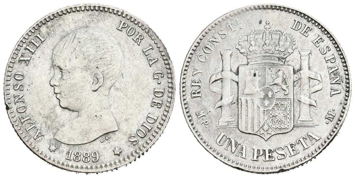 ALFONSO XIII (1885-1931). 1 Peseta. (Ar. 4.84g/23mm). 1889 *18-89. Madrid MPM. (Cal-2019-52). Almost Very Fine. Scratch. Taps on the song. Very scarce.