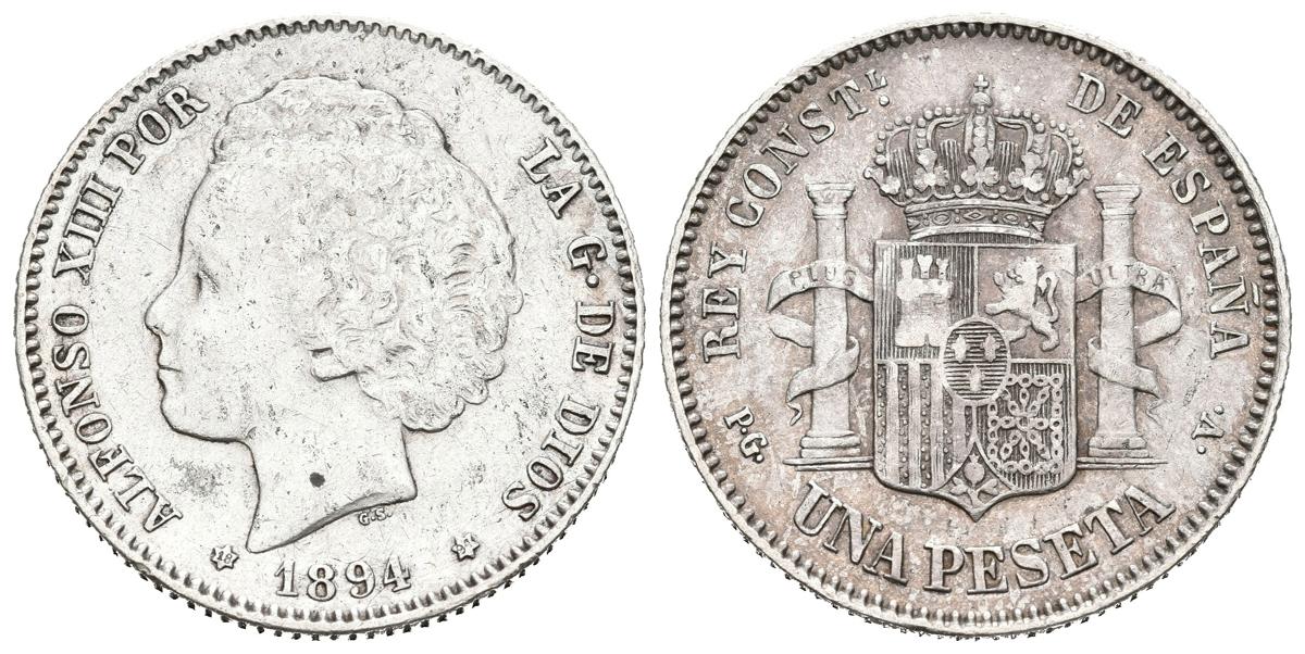 ALFONSO XIII (1885-1931). 1 Peseta. (Ar. 5.00g/23mm). 1894 *18-94. Madrid PGV. (Cal-2019-55). Good Very Fine.
