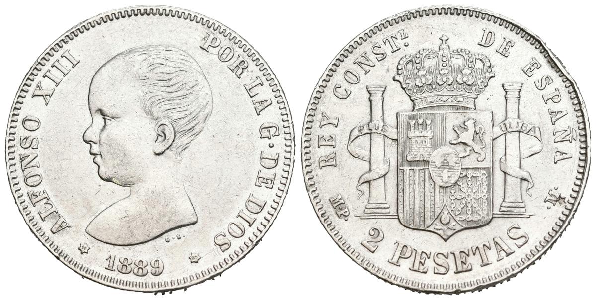 ALFONSO XIII (1885-1931). 2 pesetas. (Ar. 10.03g/27mm). 1889 *18-89. Madrid MPM. (Cal-2019-82). Almost Extremely Fine. cleaned. Singing tap.