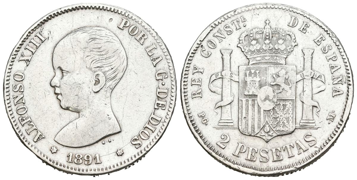 ALFONSO XIII (1885-1931). 2 pesetas. (Ar. 9.91g/27mm). 1891*18-91. Madrid PGM. (Cal-2019-84). Very Fine. cleaned. Partially visible stars.