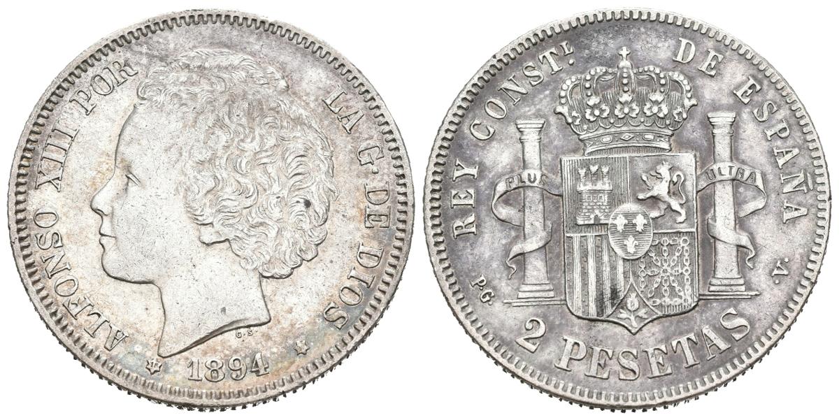 ALFONSO XIII (1885-1931). 2 pesetas. (Ar. 9.97g/27mm). 1894 *18-94. Madrid PGV. (Cal-2019-86). Good Very Fine. Little marks. nice tone
