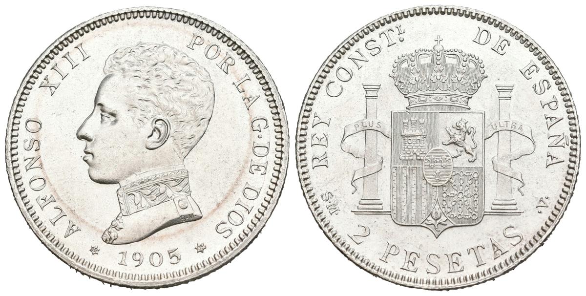 ALFONSO XIII (1885-1931). 2 pesetas. (Ar. 9.96g/27mm). 1905 *19-05. Madrid SMV. (Cal-2019-88). Good Extremely Fine. Remnants of original shine.