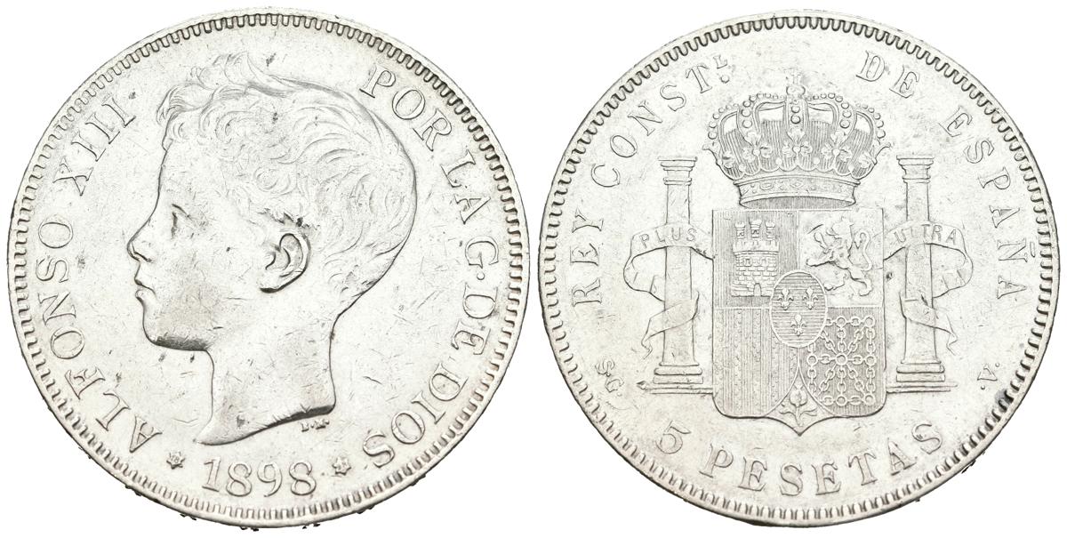 English ALFONSO XIII (1885-1931). 5 pesetas. (Ar. 25.06g/37mm). 1898*18-98. Madrid SGV. (Cal-2019-109). Good Very Fine. cleaned. Little marks.