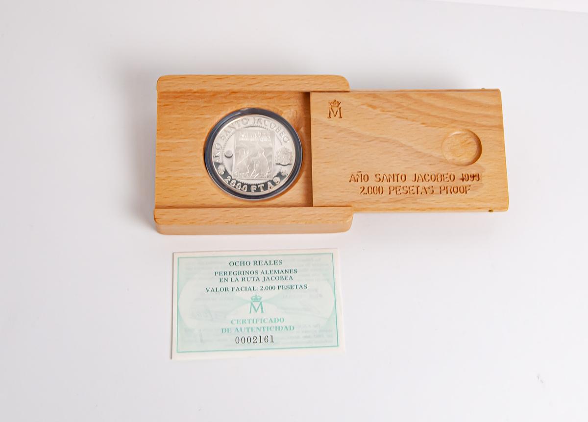 English JUAN CARLOS I (1975-2014). 2000 Pesetas (Ar. 27.00g/40mm). 1993. Jacobean Holy Year. German pilgrims. PROOF. Includes original box and certificate of authenticity.