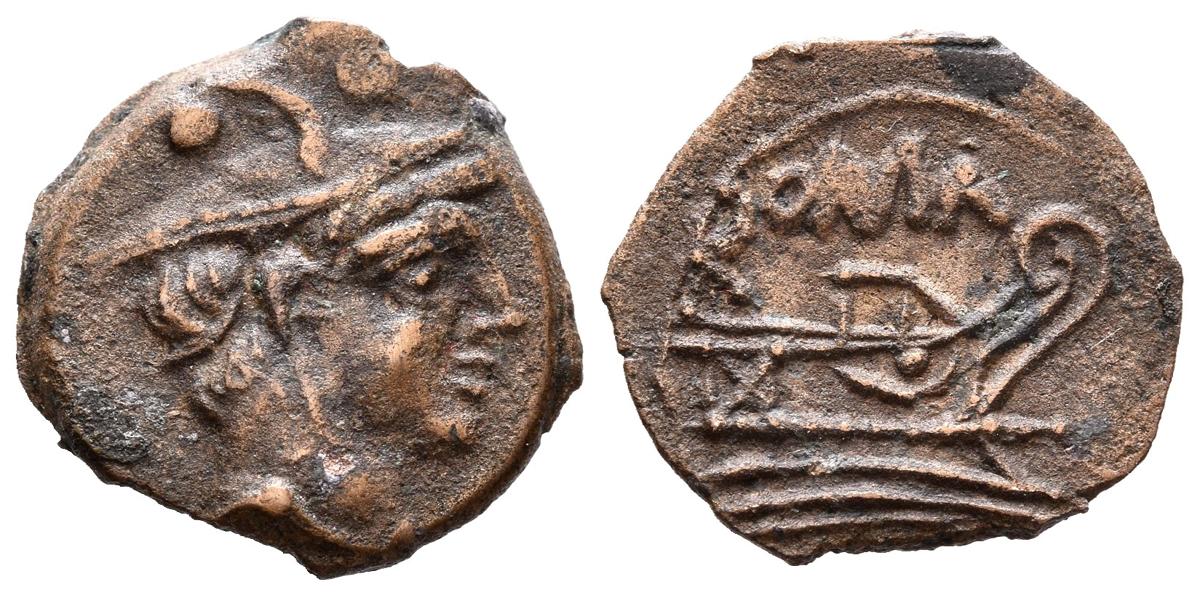 ANONYMOUS. Sextant. (Ae. 1.66g/14mm). 211 BC Rome. (Crawford 56/6). Obv: Head of Mercury with cap, above two dots. Rev: Bow to right, above legend: ROMA. Almost Extremely Fine.