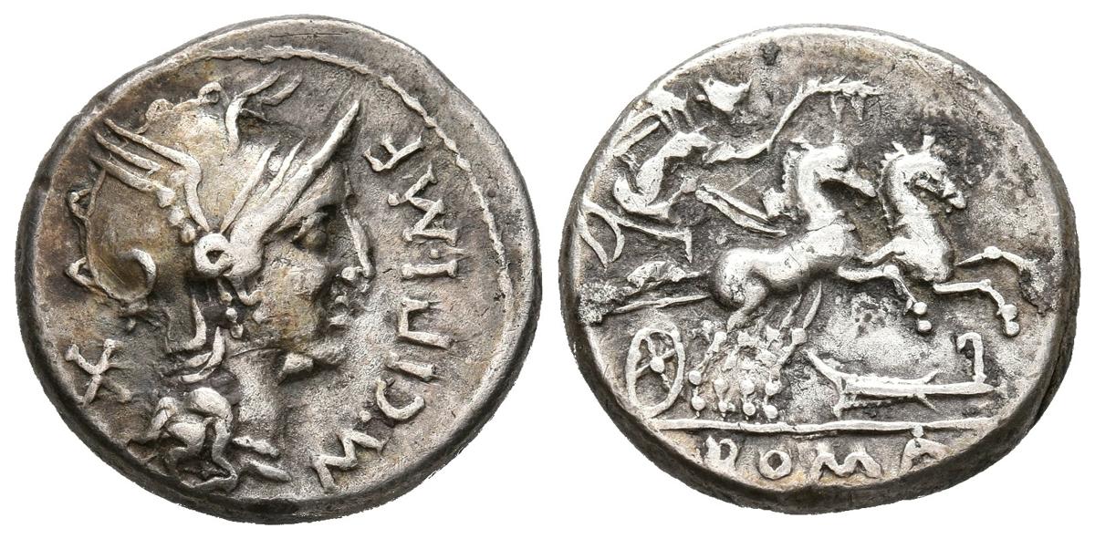 CIPIA GENS. Denarius. (Ar. 3.86g/17mm). 115-114 BC Mint uncertain. (FFC 563; Crawford 289/1). Obv: Rome head to right, in front legend: M CIPI MF, behind X. Rev: Victory with palm on beam to right, below rudder, exergue: ROMA. Very Fine.
