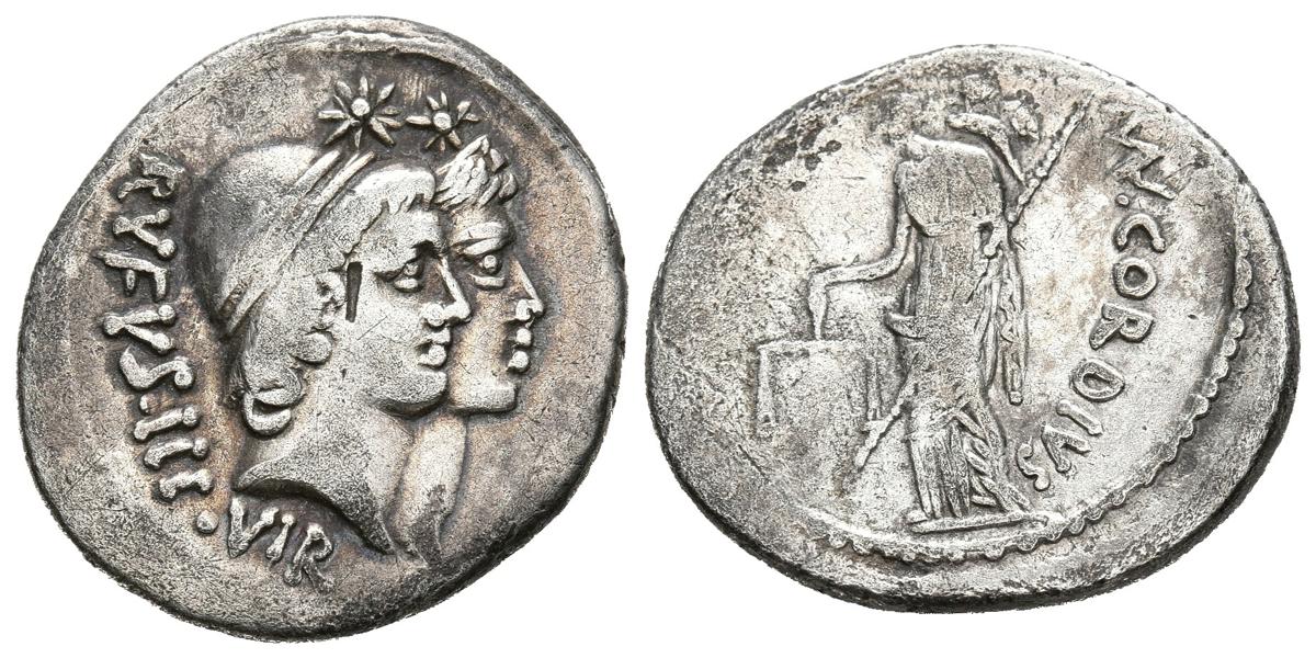 GENS CORDIA. Denarius. (Ar. 3.72g/20mm). 46 BC Rome. (FFC 602; Crawford 463/1a). Obv: Laureate heads of the Dioscuri to right surmounted, behind legend: RVFVS III VIR. Rev: Venus verticordia left with scales and sceptre, cupid behind her, behind legend: MN CORDIVS. Almost Very Fine.