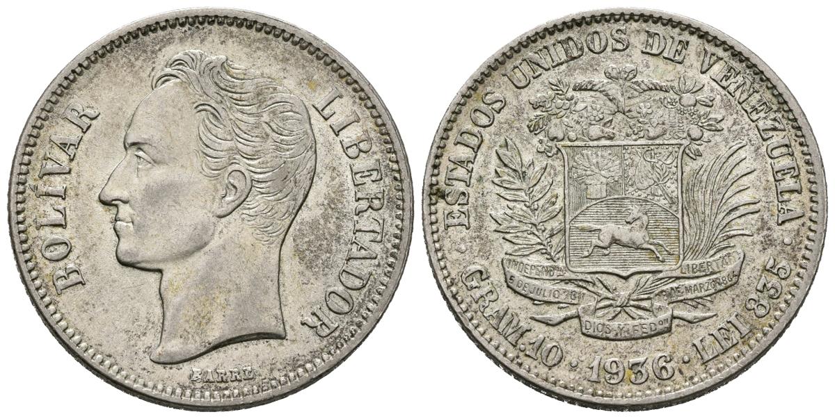 UNITED STATES OF VENEZUELA. 2 Bolivars. (Ar. 10.00g/27mm). 1936. Philadelphia. (Km#Y23). Good Extremely Fine.