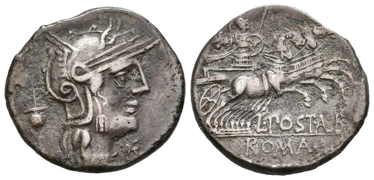 GENS POSTUMIA. Denarius. (Ar. 3.75g/19mm). 131 BC Rome. (FFC 1063; Crawford 252/1). Obv: Head of Rome right, before star, behind apex. Rev: Mars in chariot right with trophy and scepter, below legend: L POST ALB, in exergue: ROMA. Very Fine.