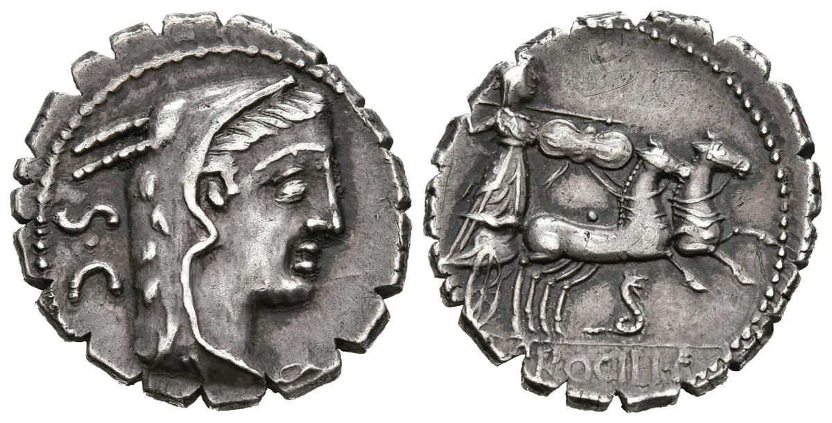 GENS PROCILIA. Denarius. (Ar. 4.13g/19mm). 80 BC Southern Italy. (Crawford 379/2; FFC 1082). Obv: Head of Juno Sospita with goatskin right, behind: Uncirculated. Rev: The same character with a shield and spear on the beam to the right, below a snake, in exergue: L PROCILI F. Good Very Fine.