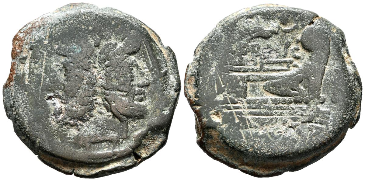 GENS TERENTIA. Ace. (Ae. 29.05g/33mm). 147 BC Rome. (Crawford 217/2). Obv: Double-faced head of Janus, above I. Rev: Prow to right, above legend: C TER LVC and Victoria flying right with laurel wreath, before I, below: ROMA. Almost Very Fine.