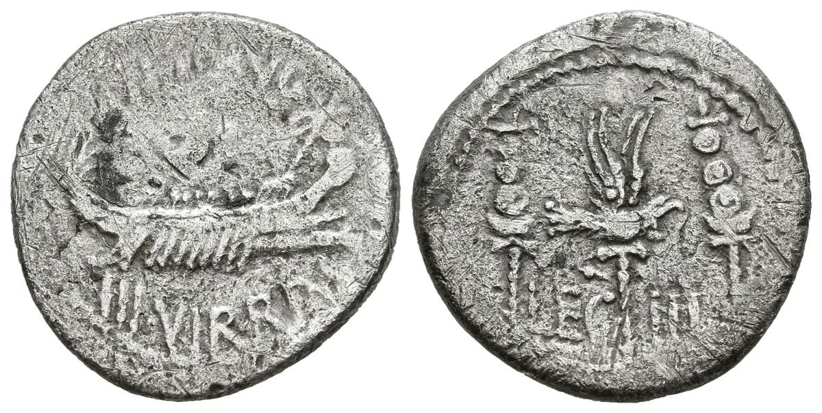 English MARK ANTONY. Denarius. (Ar. 3.43g/18mm). (FFC 33; Crawford 544/15). Obv: Praetorian galley right, around legend: ANT AVG III VIR RPC. Rev: Legionary eagle between two military insignia, including legend: LEG III. Very Fine.