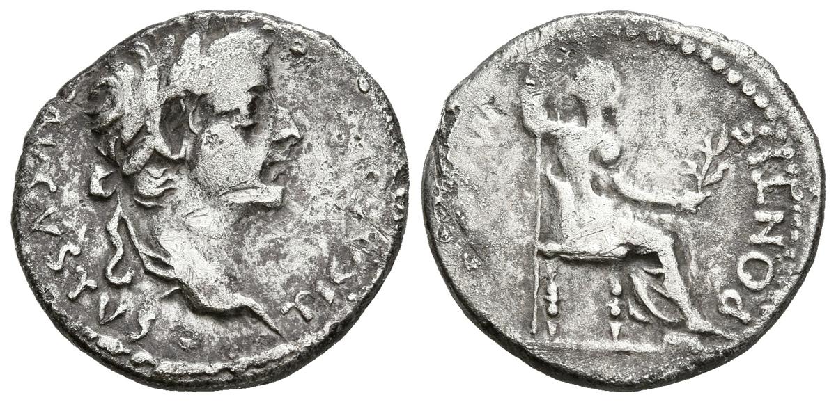 English TIBERIUS. Denarius. (Ar. 3.41g/18mm). 36-37 AD Lugdunum. (IQR 30). Obv: Head of Tiberius right, around legend: TI CAESAR DIVI AVG AVGVSTVS. Rev: Livia seated right with branch and scepter, around legend: MAXIM PONTIF. Almost Very Fine.