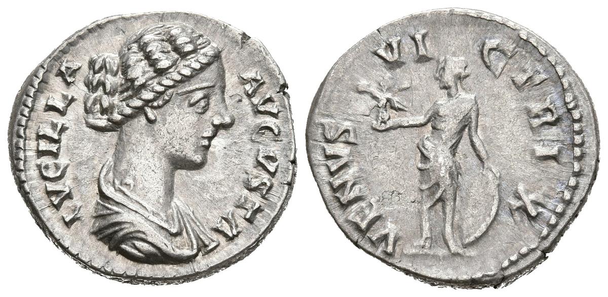 LUCILLA. Denarius. (Ar. 3.44g/18mm). 164-169 AD Rome. (RIC 786). Obv: Diademed and draped bust of Lucilla right, around legend: LVCILLA AVGVSTA. Rev: Venus standing left holding Victoria and shield, around legend: standing VICTRIX. Almost Extremely Fine/ Good Very Fine. Nice obverse.