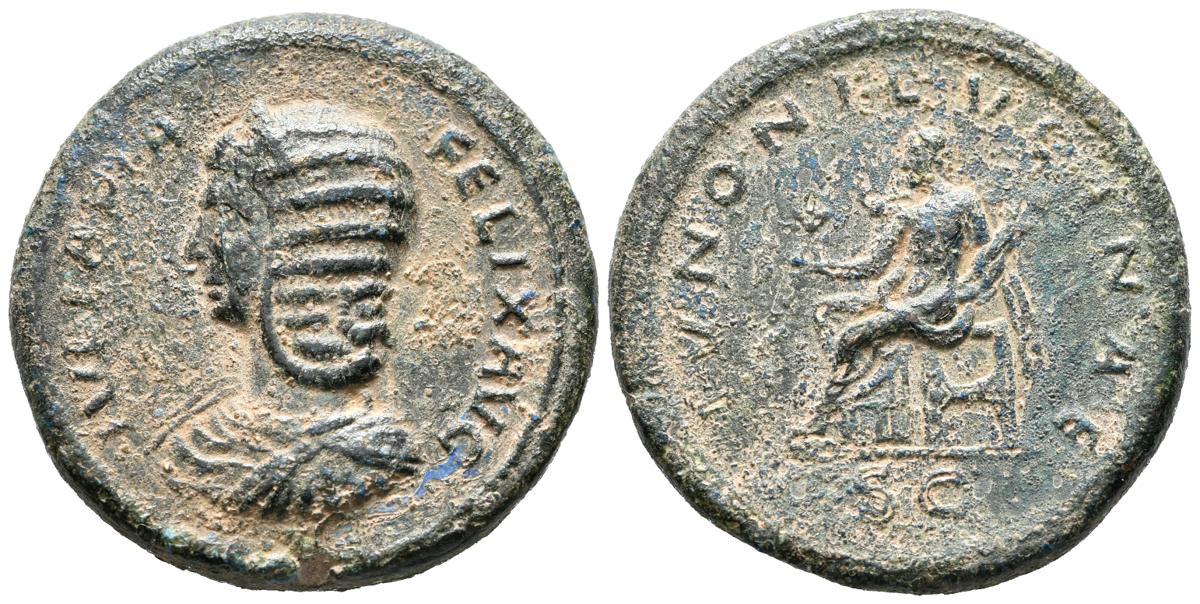 English JULIA DOMINA. Sesterce. (Ae. 22.51g/33mm). 196-211 AD Rome. (RIC 856). Obv: Diademed, draped and armored bust of Julia Domna left, around legend: IVLIA PIA FELIX AVG. Rev: Juno seated left holding flower and cornucopia, in exergue: Uncirculated, around legend: IVNONI LVCINAE. Very Fine. Scarce copy.