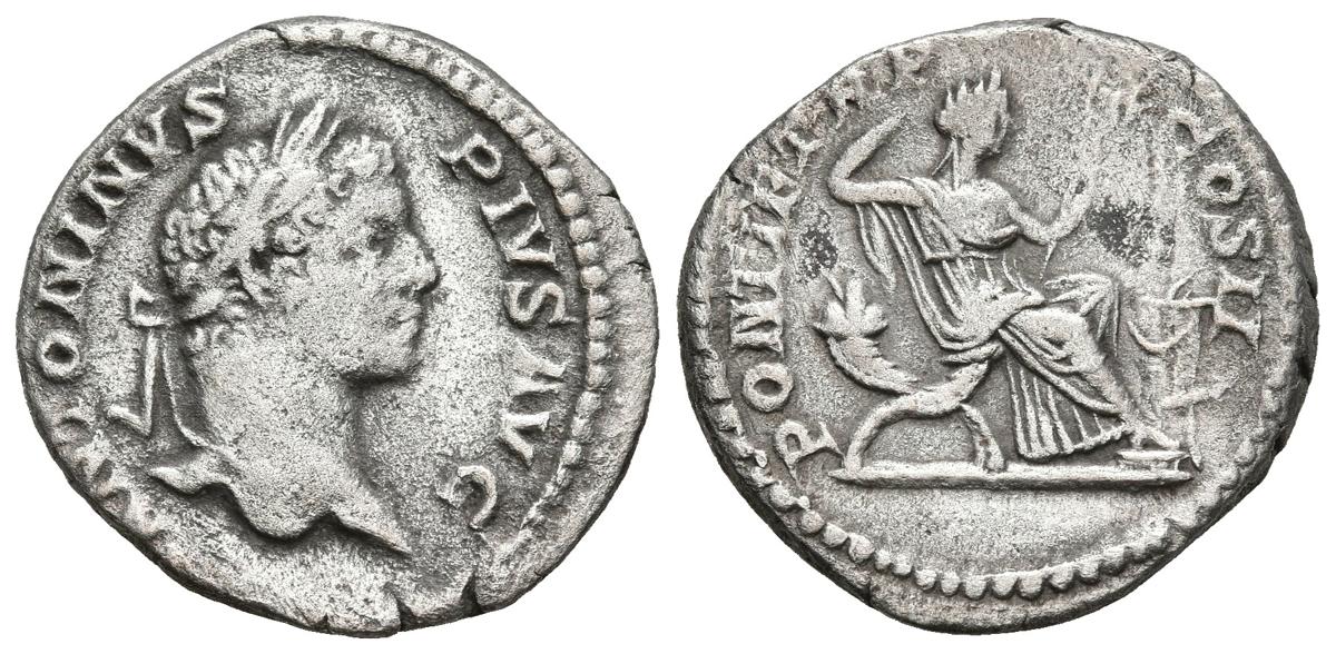 CARACALLA. Denarius. (Ar. 3.46g/19mm). 207 AD Rome. (RIC 92). Obv: Laureate head of Caracalla right, around legend: ANTONINVS PIVS AVG. Rev: Securitas sitting right holding scepter, in front of altar, around legend: PONTIF TR PX COS II. Almost Very Fine.