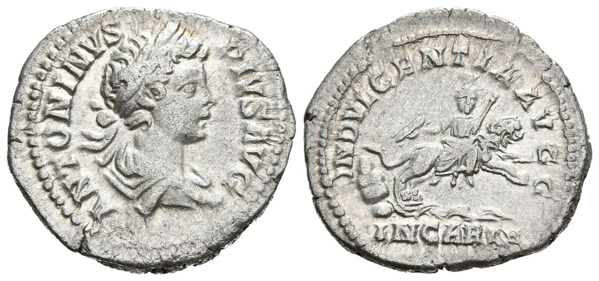 CARACALLA. Denarius. (Ar. 3.00g/20mm). 201-206 AD Rome. (RIC 130a). Obv: Laureate and draped bust of Caracalla right, around legend: ANTONINVS PIVS AVG. Rev: Dea Caelestis carrying a thunderbolt and a scepter on a lion to the right, in exergue: IN CARTH, around legend: INDVLGENTIA AVGG. Good Very Fine.