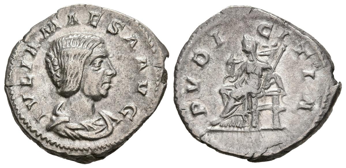 JULIA MAESA. Denarius. (Ar. 3.33g/20mm). 218-225 AD Rome. (RIC 268). Obv: Draped bust of Julia Maesa right, around legend: IVLIA MAESA. Rev: Pudicitia seated left holding sceptre, legend around: PVDICITIA. Good Very Fine.