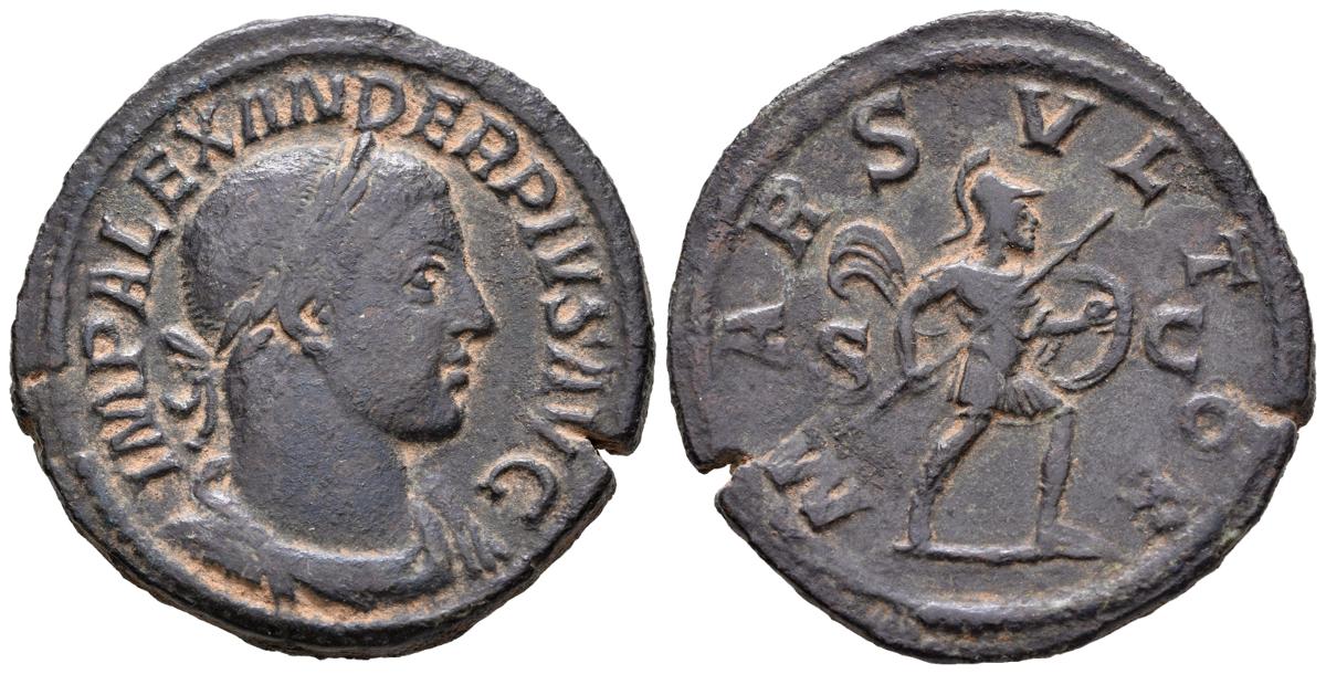 SEVERUS ALEXANDER. Sesterce. (Ae. 21.31g/32mm). 232 AD Rome. (RIC 635). Obv: Laureate, draped and cuirassed bust of Alexander Severus right, legend around: IMP ALEXANDER PIVS AVG. Rev: Mars advancing right carrying spear and shield, between: Uncirculated, around legend: MARS VLTOR. Almost Very Fine.