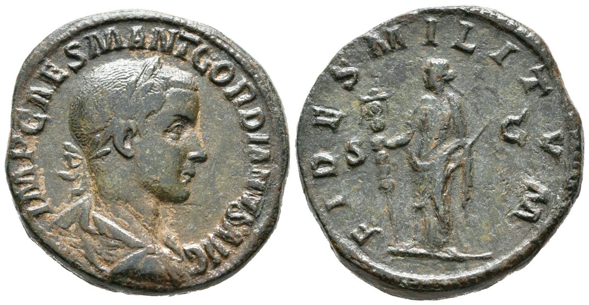 GORDIAN III. Sesterce. (Ae. 21.51g/31mm). 238-239 AD Rome. (RIC 254). Obv: Laureate and draped bust of Gordian III right, around legend: IMP CAES M ANT GORDIANVS AVG. Rev: Fides standing left holding standard and scepter, between: Uncirculated, around legend: FIDES MILITVM. Good Very Fine.