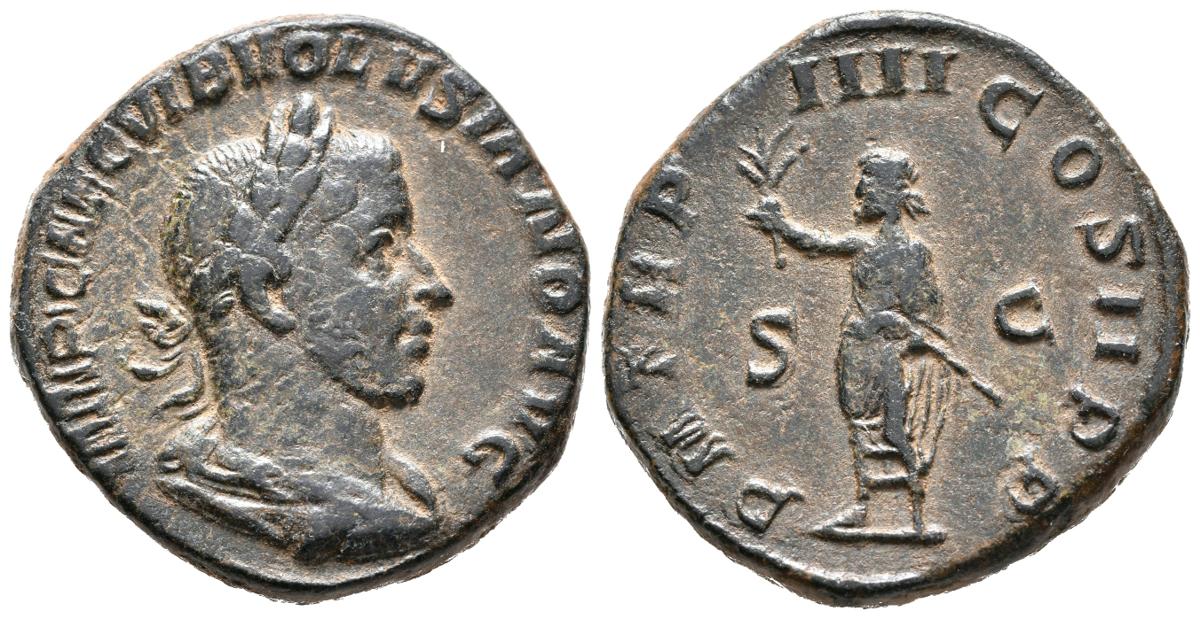 VOLUSIAN. Sesterce. (Ae. 18.21g/29mm). 251-253 AD Rome. (RIC 244). Obv: Laureate and draped bust of Volusiano right, around legend: IMP CAE C VIB VOLVSIANO AVG. Rev: standing left holding branch and scepter, between: Uncirculated, around legend: PM TR P IIII COS II P P. Very Fine.