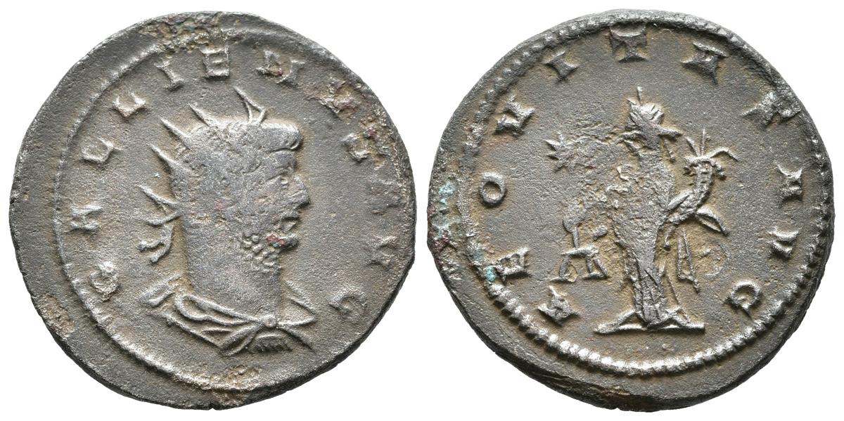 GALLIENUS. Antoninian. (Ae. 3.98g/22mm). 263 AD Antioch. (RIC 627). Obv: radiated bust, draped with Gallienus' breastplate right, legend around: GALLIENVS AVG. Rev: standing left holding scales and cornucopia, in star field, around legend: AEQVITAS AVG. Almost Very Fine.