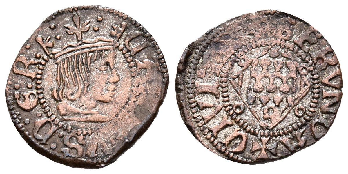 CARLOS I (1516-1556). Diner (Ae. 0.96g/16mm). S/D (1553). Girona. (Cal-2019-6). Bust to right and G on shield. Good Very Fine. cleaned.