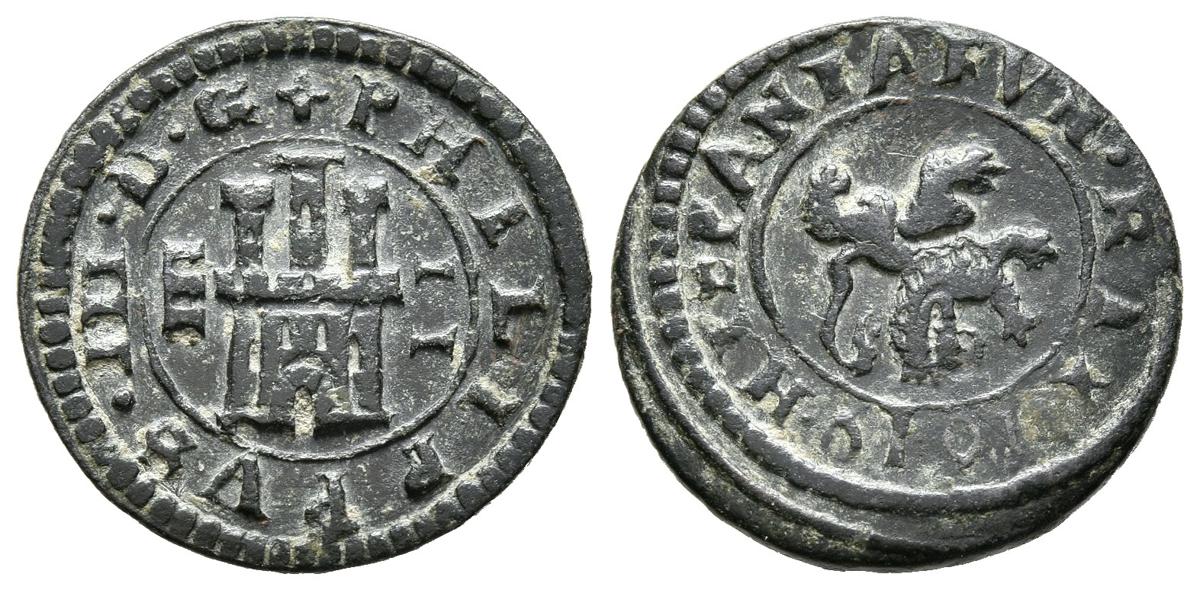 English PHILIP III (1598-1621). 2 Marvels. (Ae. 1.83g/16mm). 1619. Segovia. (Cal-2019-194). vertical aqueduct. Very Fine.
