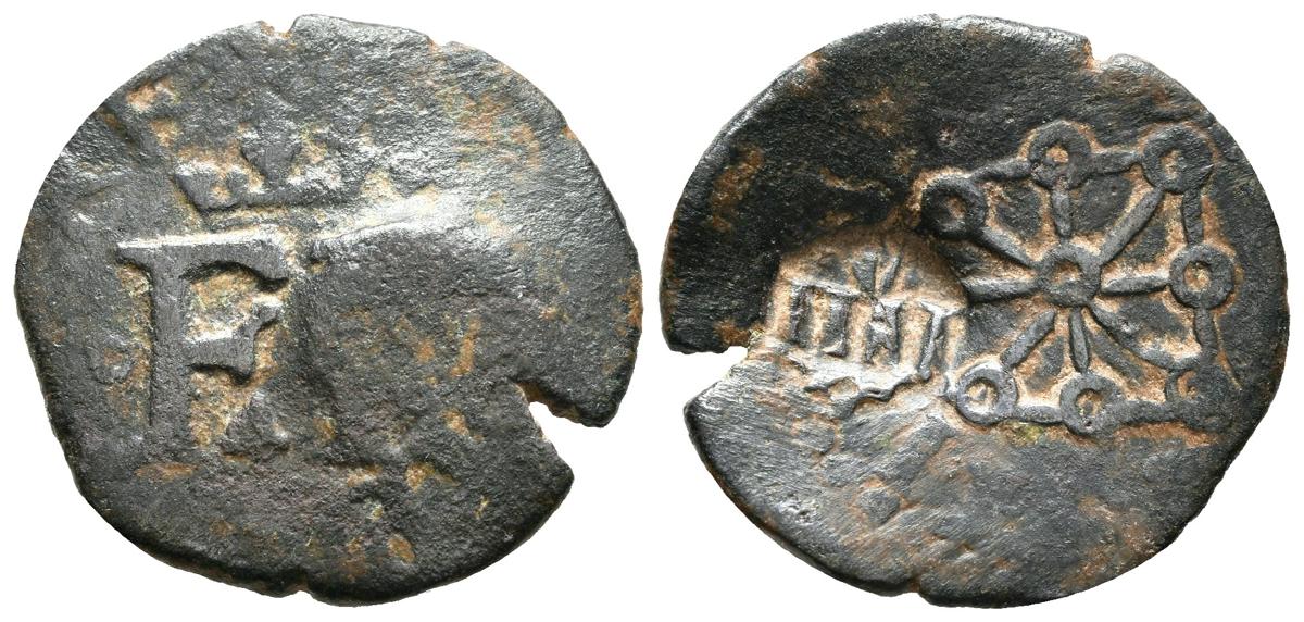 PHILIP IV (1621-1665). 4 horned. (Ae. 2.89g/21mm). Date not visible. Pamplona. Countermark of IIII Maravedís. (Cal-2019-Type 19). Almost Very Fine.