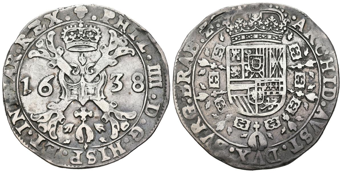PHILIP IV (1621-1665). 1/2 Patagonian (Ar. 13.92g/36mm). 1638. Brussels. (Delmonte-303). Good Very Fine. Spectacular patina.