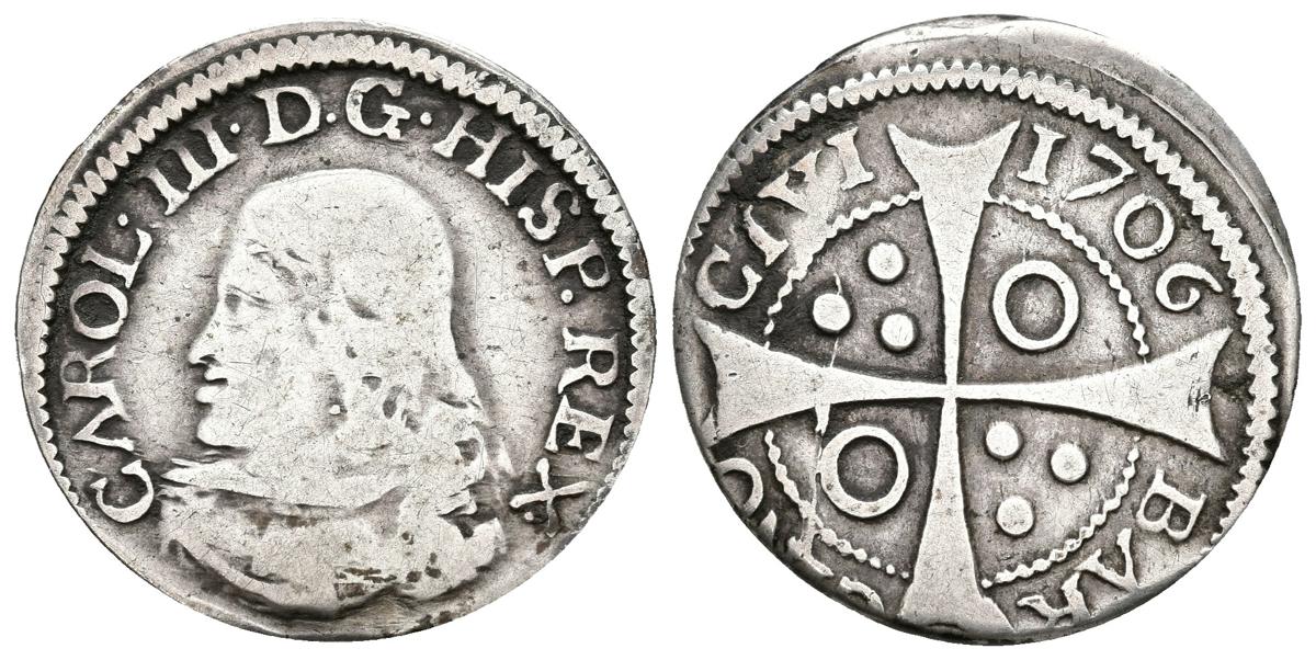CARLOS III, the Pretender (1700-1714). 1 Croat. (Ar. 2.03g / 21mm). 1706. Barcelona. (Cal-2019-21). Roel in first and cuarto quarters. Almost Very Fine/ Very Fine. Limited.