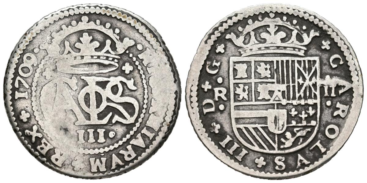 CARLOS III, the Pretender (1700-1714). 2 Reales. (Ar. 4.75g / 27mm). 1709. Barcelona. (Cal-2019-30). Fine/ Good Fine. V for Carolvs is an inverted A.