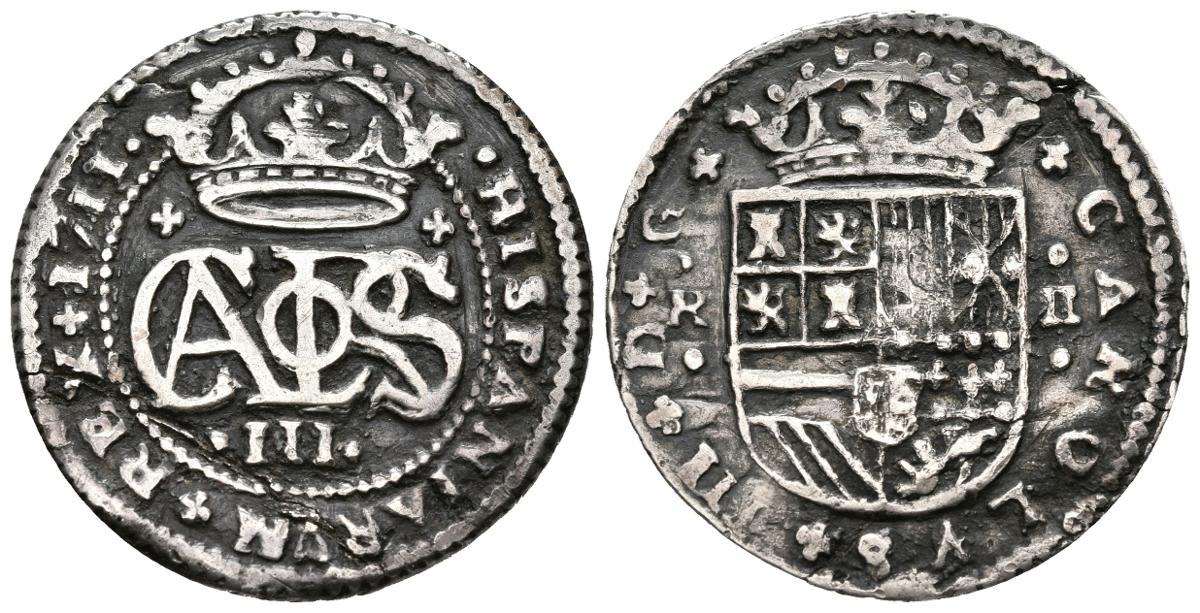 English CARLOS III, the Pretender (1700-1714). 2 Reales. (Ar. 4.37g / 27mm). 1711. Barcelona. (Cal-2019-32). Very Fine. dark patina