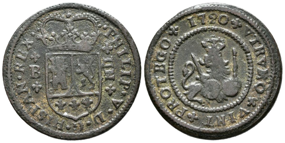 PHILIP V (1700-1746). 4 Maravedis (Ae. 7.52g/27mm). 1720. Barcelona. (Cal-2019-84). Almost Very Fine
