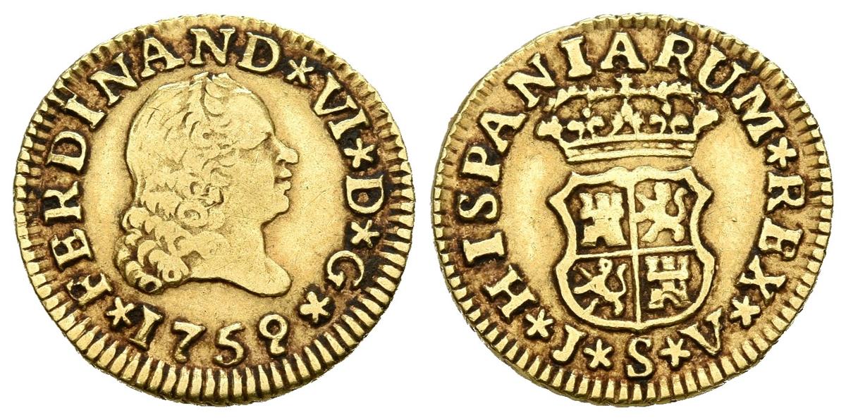 FERDINAND VI (1746-1759). 1/2 Escudo (Au. 1.76g/15mm). 1759. Sevilla JV. (Cal-2019-587). Cuarto bust. Stars delimiting mint and assayer. Very Fine. nice tone