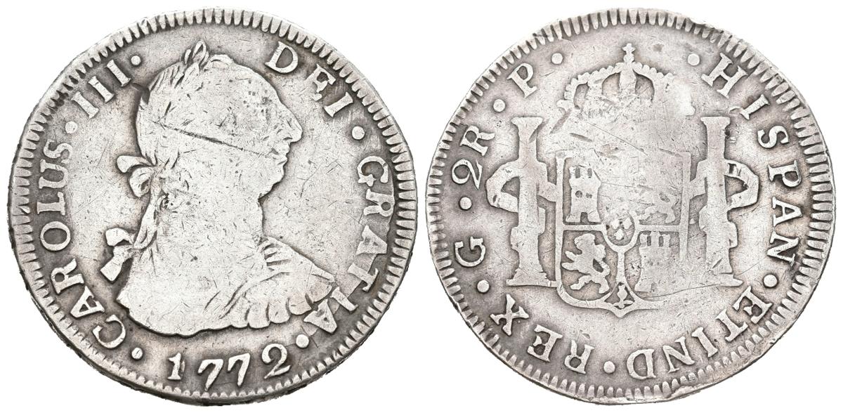 English CARLOS III (1759-1788). 2 Reales (Ar. 6.21g/28mm). 1772. Guatemala P. (Cal-2019-558). Fine. Limited.