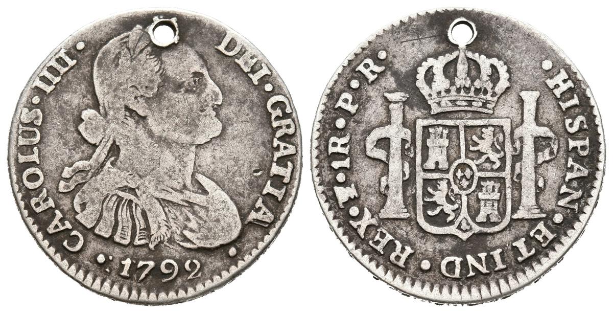 English CARLOS IV (1788-1808). 1 Real (Ar. 3.24g/21mm). 1799. Potosí PR. (Cal-201-463). First bust. Almost Very Fine. Hole at 12 o'clock. Scarce.