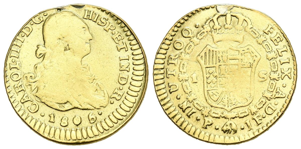 English CARLOS IV (1788-1808). 1 Escudo. (Au. 3.24g/19mm). 1805. Potosi JF. (Cal-2019-1166). Fine. Welding remains. Limited.