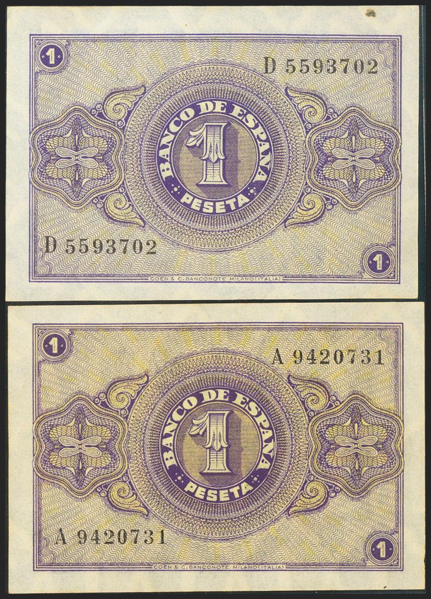 English Set of 2 1 Peseta bills issued on February 28, 1938, with series A and D, respectively. (Edifil 2021: 427), present original sizing. Almost Uncirculated/ Good Extremely Fine.