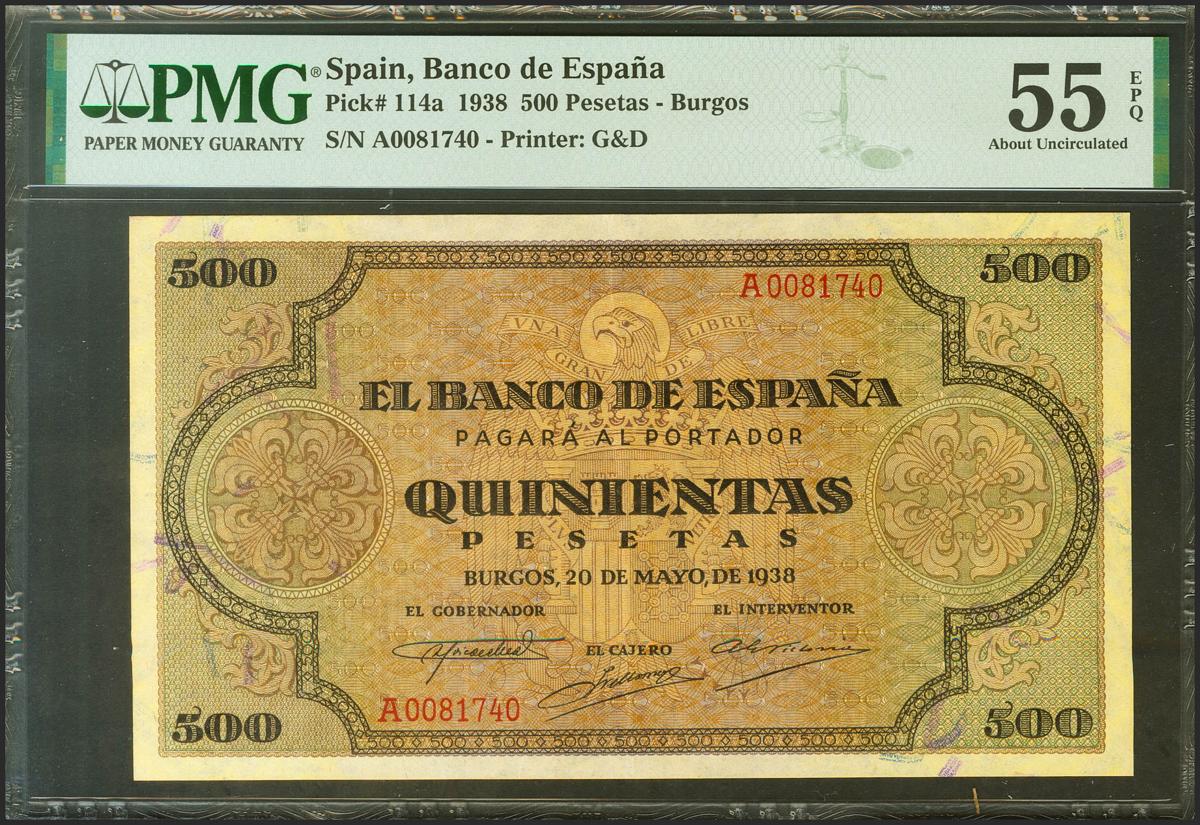 500 pesetas. May 20, 1938. Series A. (Edifil 2021: 433, Pick: 114a). It retains all its original sizing. Good Extremely Fine. PMG55EPQ.