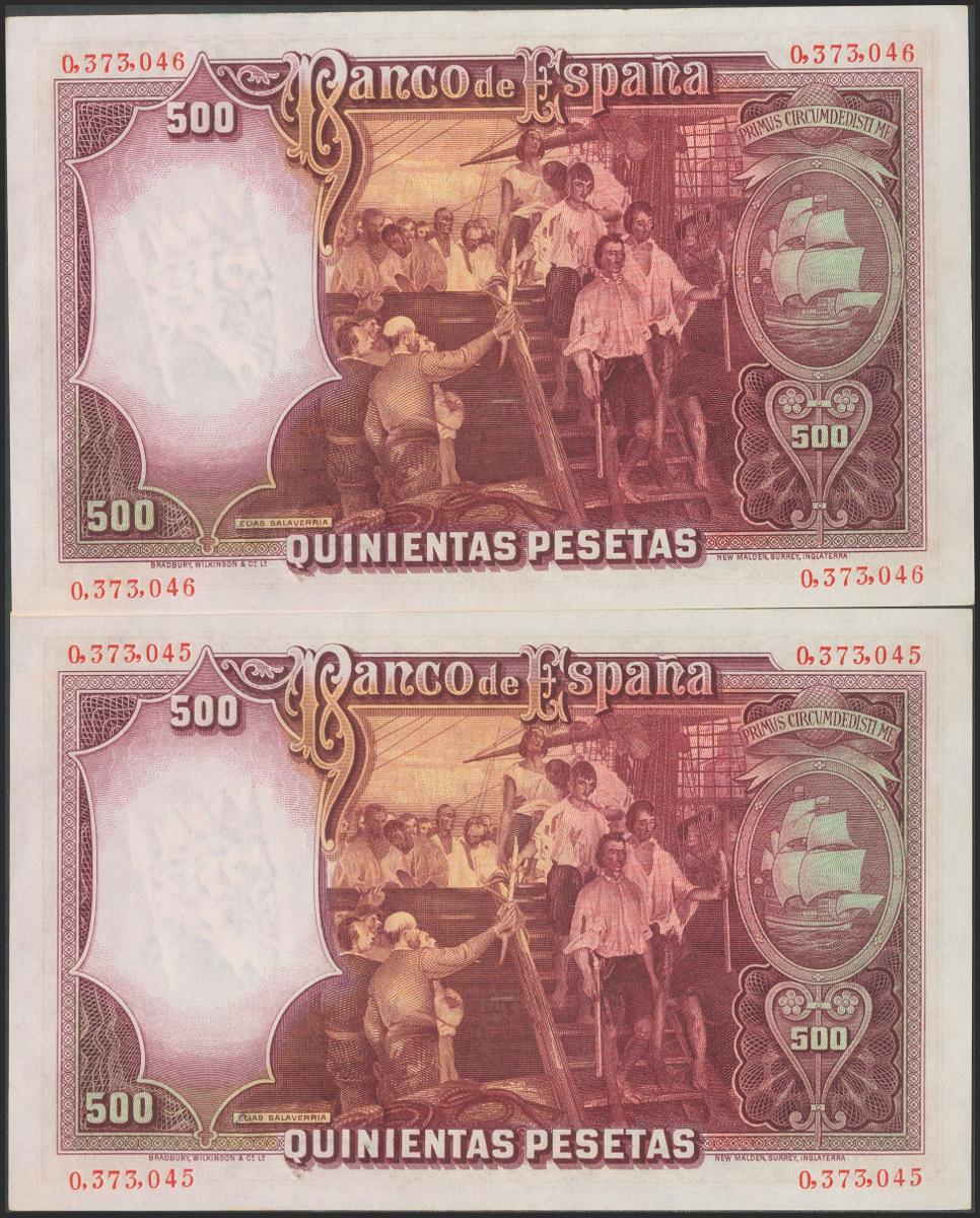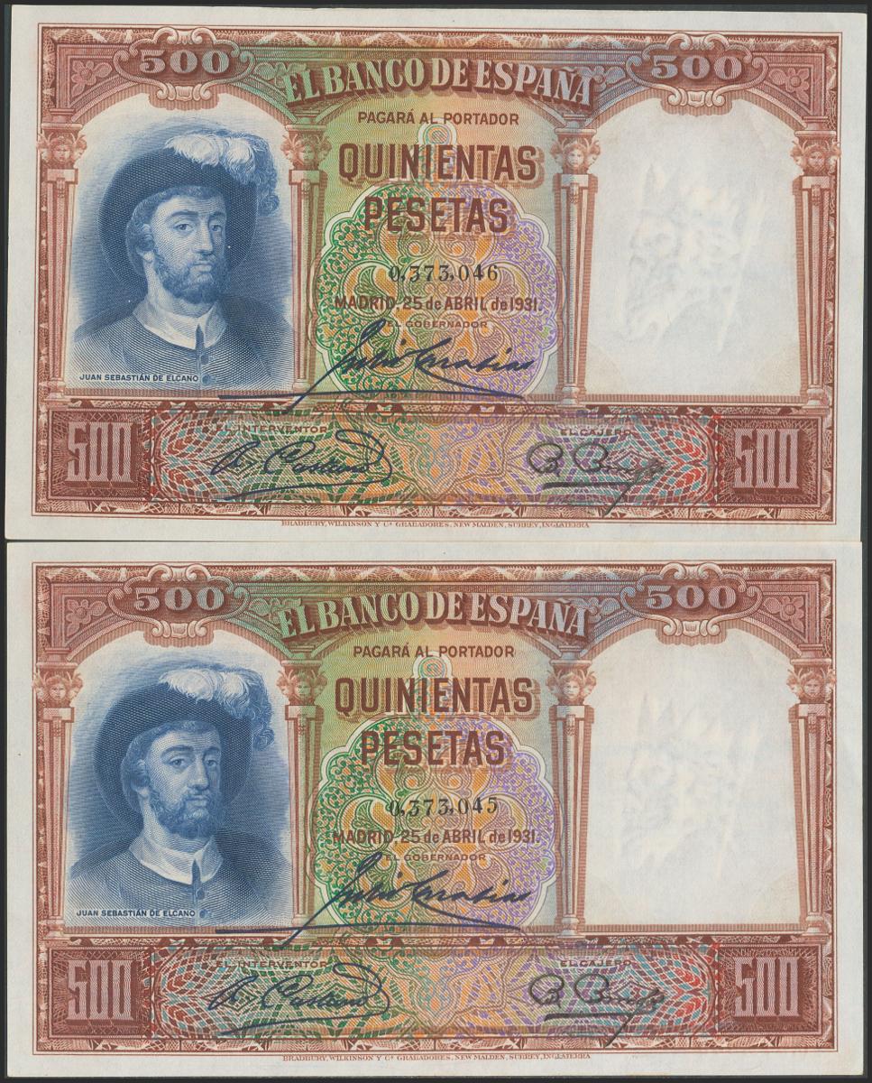 500 pesetas. April 25, 1931. Correlative couple. No serie. (Edifil 2021: 361). Original sizing. Almost Uncirculated.