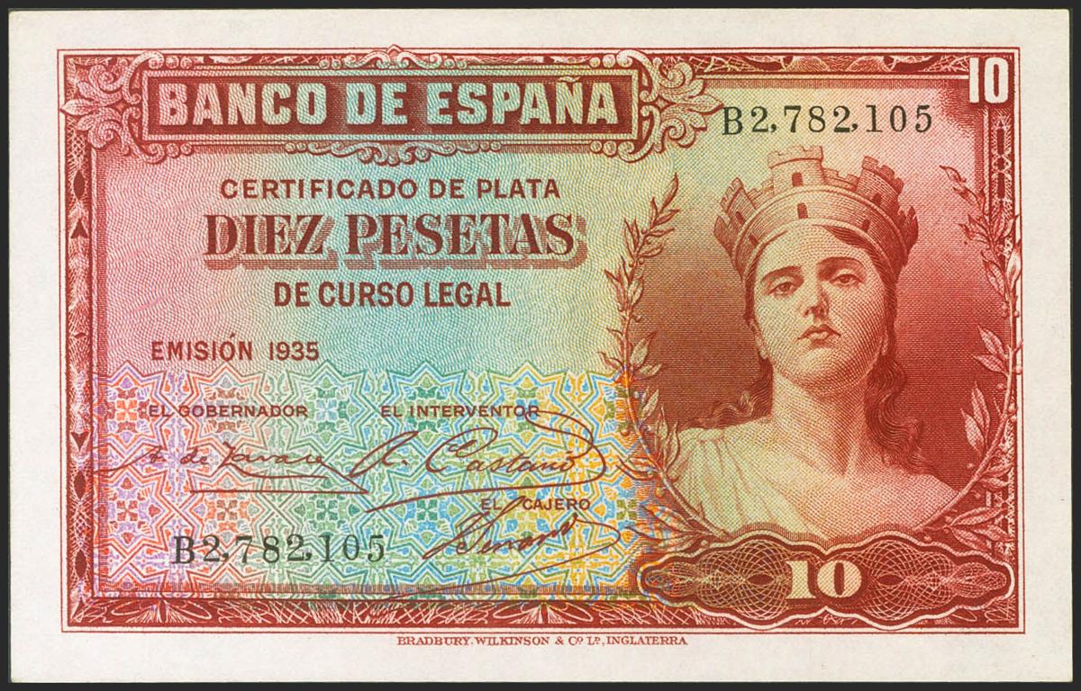 10 pesetas. 1935. Silver Certificate. Series B. (Edifil 2021: 364a). It retains all its original sizing. Uncirculated.