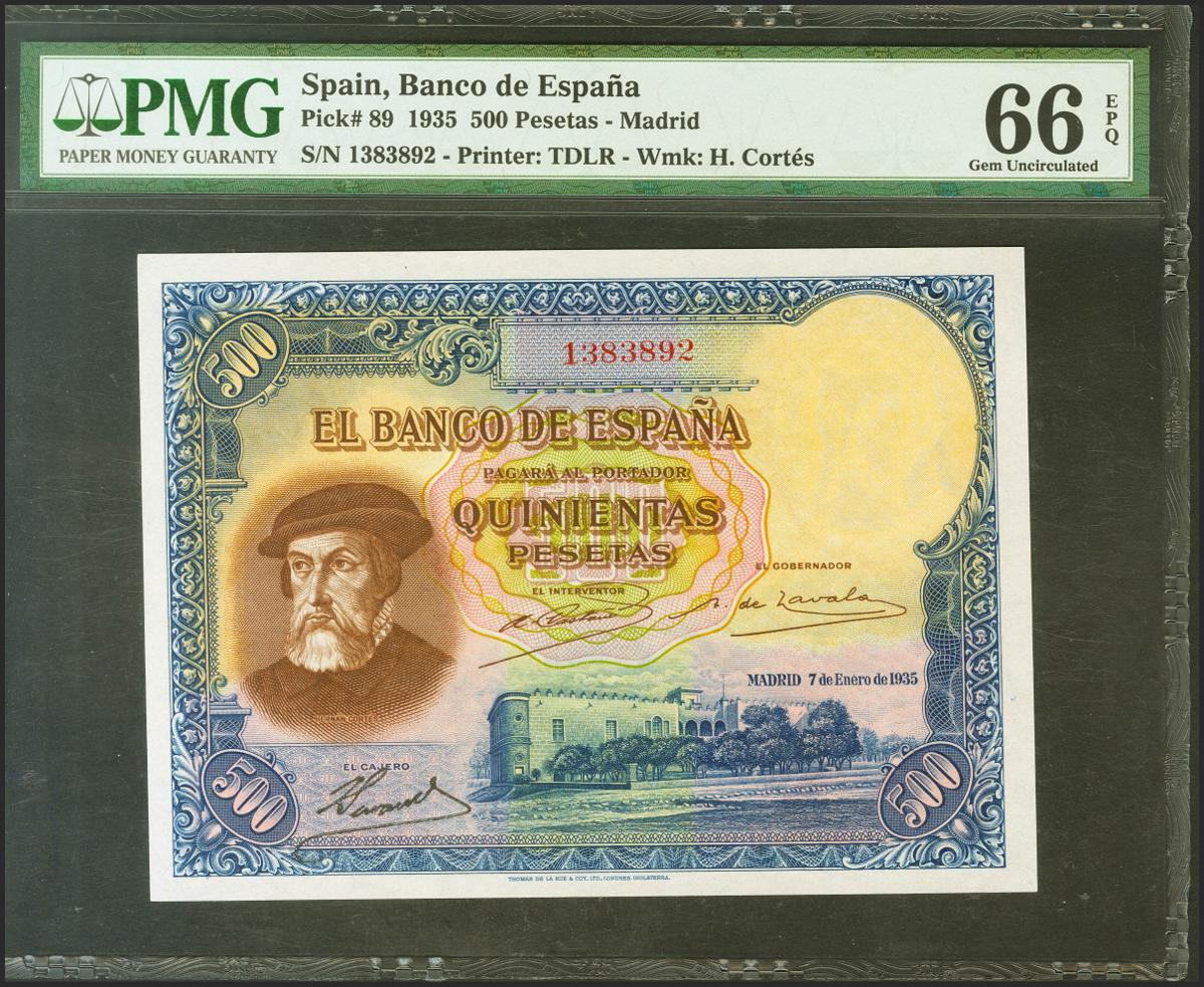 500 pesetas. January 7, 1935. No series. (Edifil 2021: 365, Pick: 89). Original sizing. Uncirculated. PMG66EPQ package.