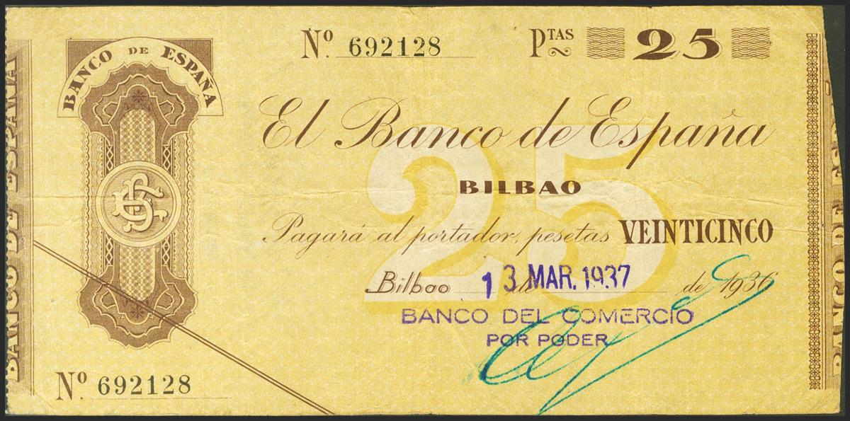 25 pesetas. 1936. No series. Bilbao branch and Banco del Comercio presignature. (Edifil 2021: 369b). Good Very Fine.