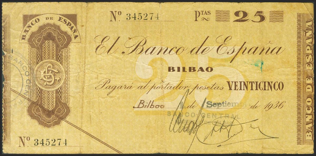 25 pesetas. 1936. No series. Bilbao branch and Central Bank signature. (Edifil 2021: 369c). Very Fine.