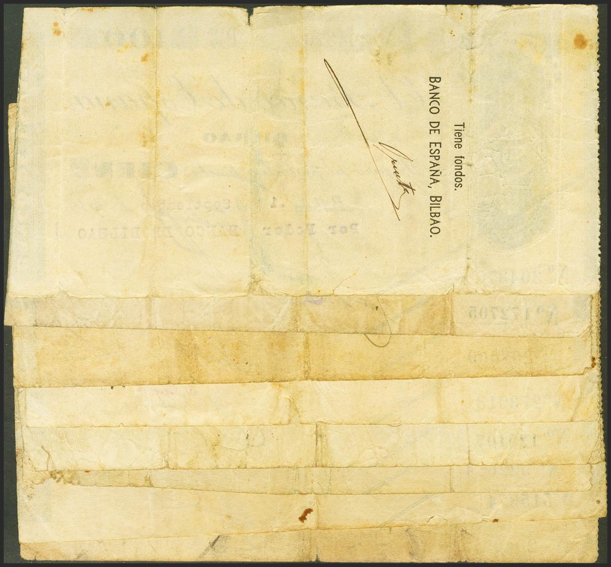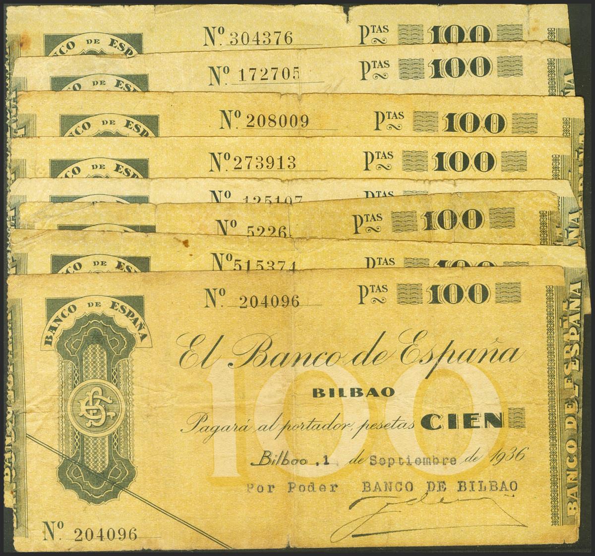 English Set of 8 100-peseta bills issued on September 1, 1936 at the Bilbao branch and with five different presignatures, in various qualities. Good Fine/ Good. TO EXAMINE.