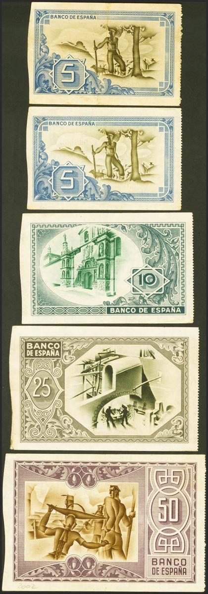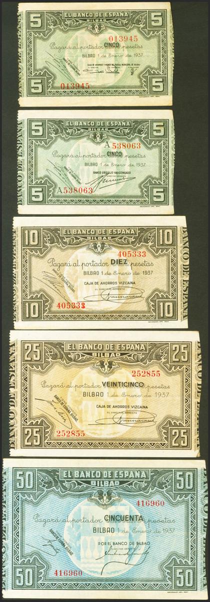 English Set of 5 banknotes without the lateral matrices of the Bank of Bilbao, 5 Pesetas without series with the presignature of Caja de Ahorros y Monte de Piedad Municipal de Bilbao, 5 Pesetas with series A and presignature of Banco Urquijo Vascongado, 10 Pesetas without series with the presignature of Caja de Ahorros Vizcaína, the 25 Pesetas without series with the presignature of Caja de Ahorros Vizcaína and the 50 Pesetas without series with the presignature of Banco de Bilbao, issued on January 1, 1937. (Edifil 2021: 385a, 386f, 387f, 388a, 389a). Very Fine/ Almost Extremely Fine.