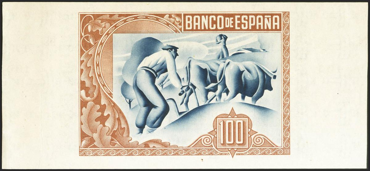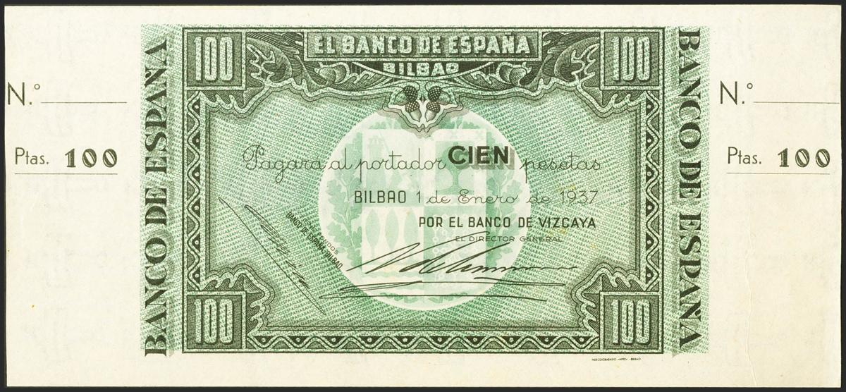 100 pesetas. January 1, 1937. Bilbao branch, presigned by Banco de Vizcaya. Without series and without numbering, with both matrices. (Edifil 2017: 390b). Original sizing. Almost Uncirculated.