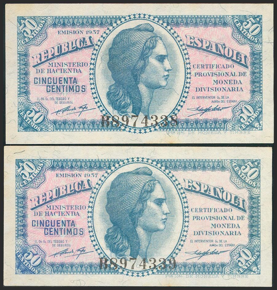 50 cents. 1937. Ministry of Finance. Correlative pair. Series B. (Edifil 2021: 391). Original sizing, shadows. Almost Uncirculated.