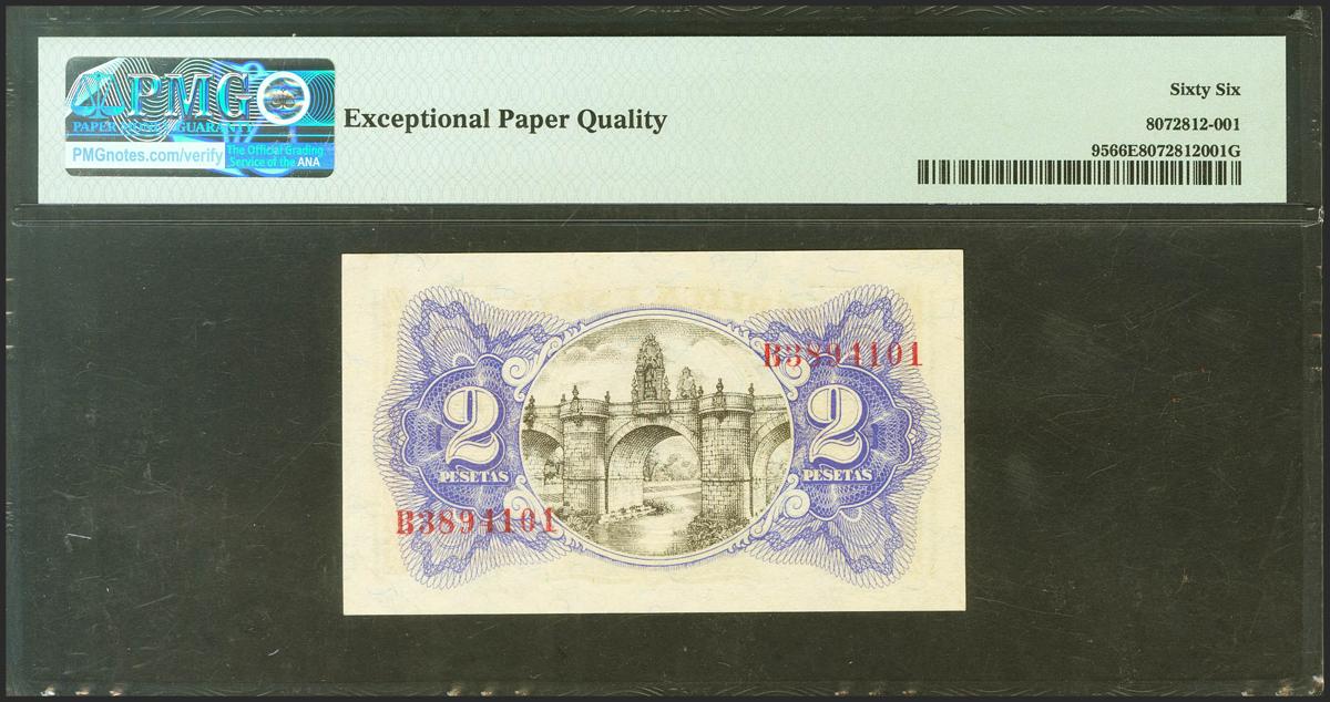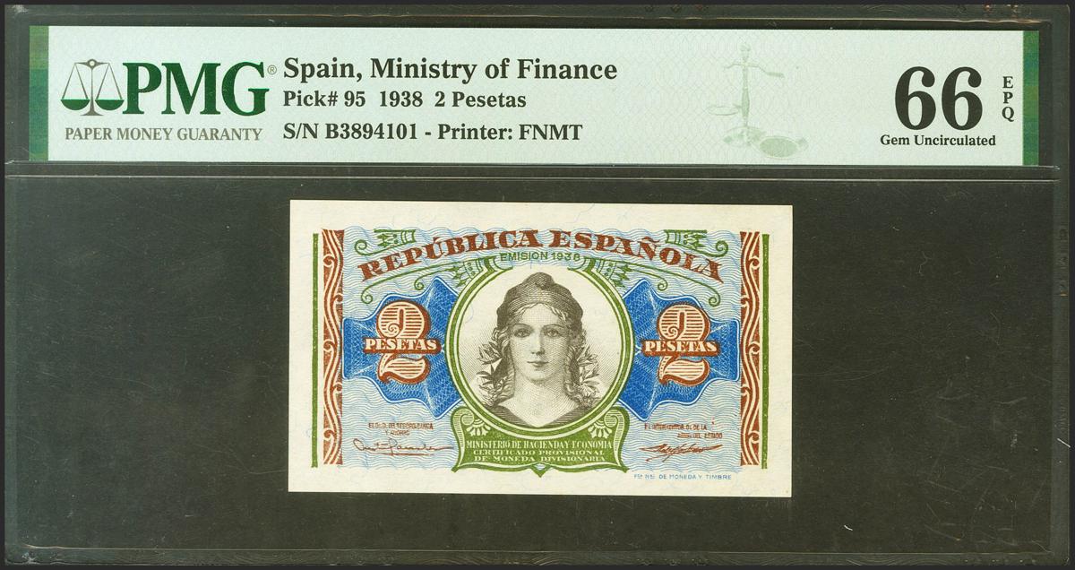 English 2 pesetas. 1938. Ministry of Justice. Series B. (Edifil 2021: 393, Pick: 95). Original sizing. PMG66EPQ package.